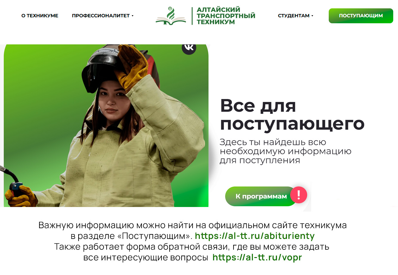 Важную информацию можно найти на официальном сайте техникума, в разделе «Поступающему». https://al-tt.ru/abiturienty